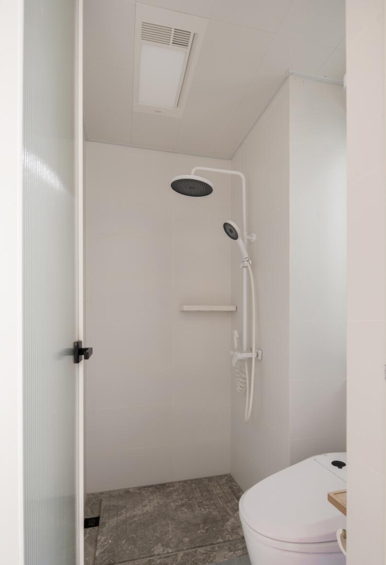 变窄的卫生间放弃了独立的淋浴设计,可以让使用更加宽敞舒适。当然后期可以安装浴帘起到阻水的作用。
