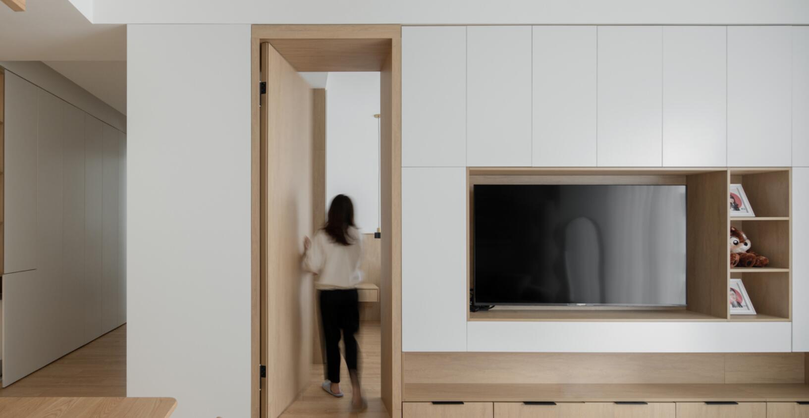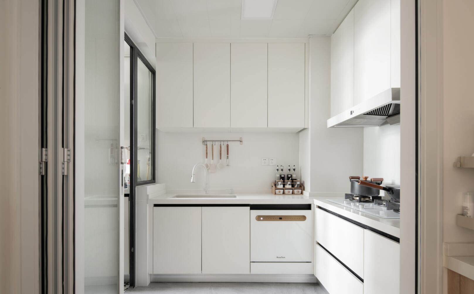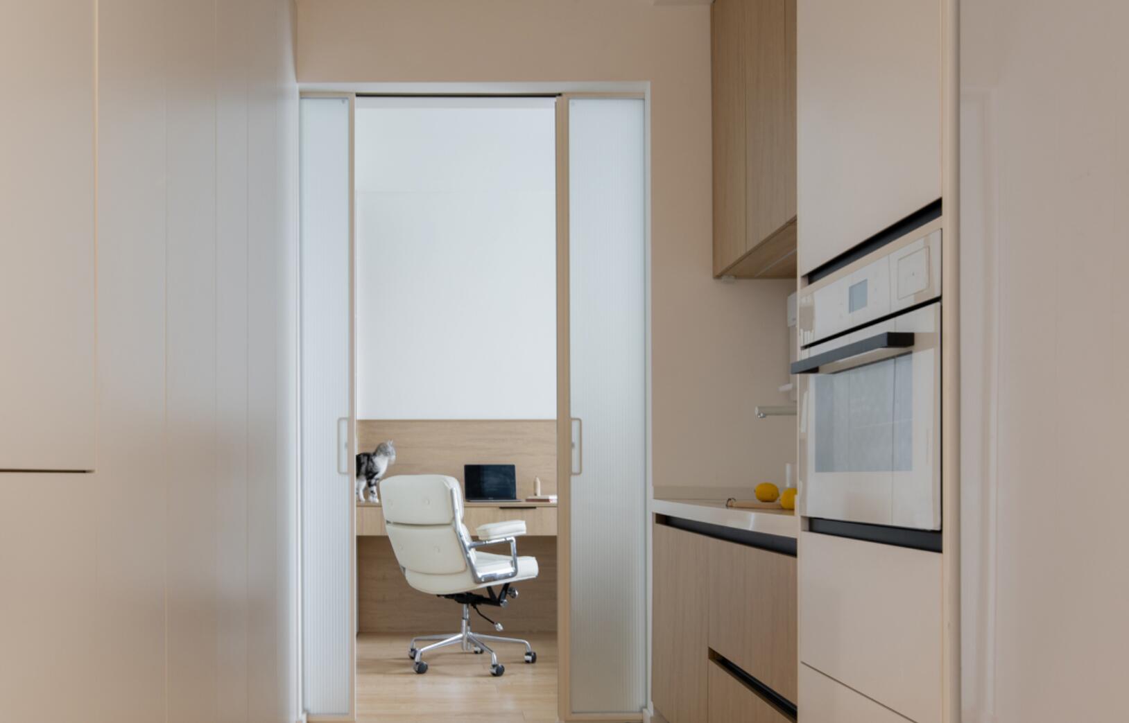 在原有的空间结构中,厨房从门洞处退了出来,安装了折叠玻璃门。这不仅让空间实现了自由,也瞬间打开了玄关区域的通透性,让空间更加宽敞。