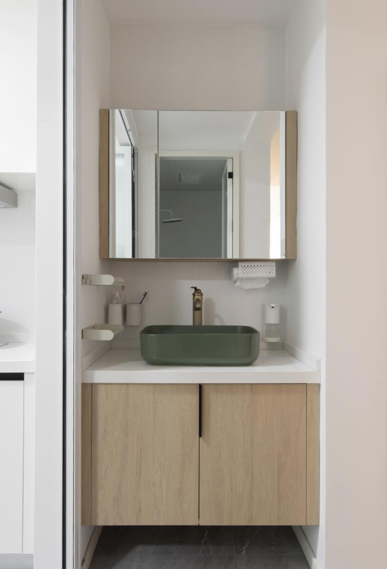 厨卫空间重组后,面盆独立于外,与厨柜对齐。这样一来,卫生间不仅实现了干湿分离,还提高了生活的便利性。尤其是后疫情时代,玄关旁边有个洗漱池,卫生的问题从房子开始就已经消除了。