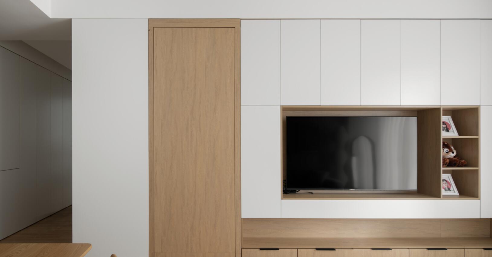 电视背景墙采用目前流行的组合柜设计。虽然效果比较平淡,但是实用性很强。同时,在白色调的情况下,纠结的柜体结构设计也丰富了空间。当然,为了保证视觉的整体性,左边的主卧也做了隐形门设计。