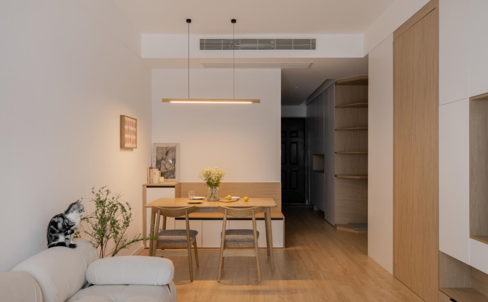穿过门廊是一个客人餐厅。空间以大面积的泛白为主,搭配低饱和度的沙发和原木餐桌。它不仅在视觉上具有立体的层次,营造出一种温柔、疗愈、随意的空间氛围。
