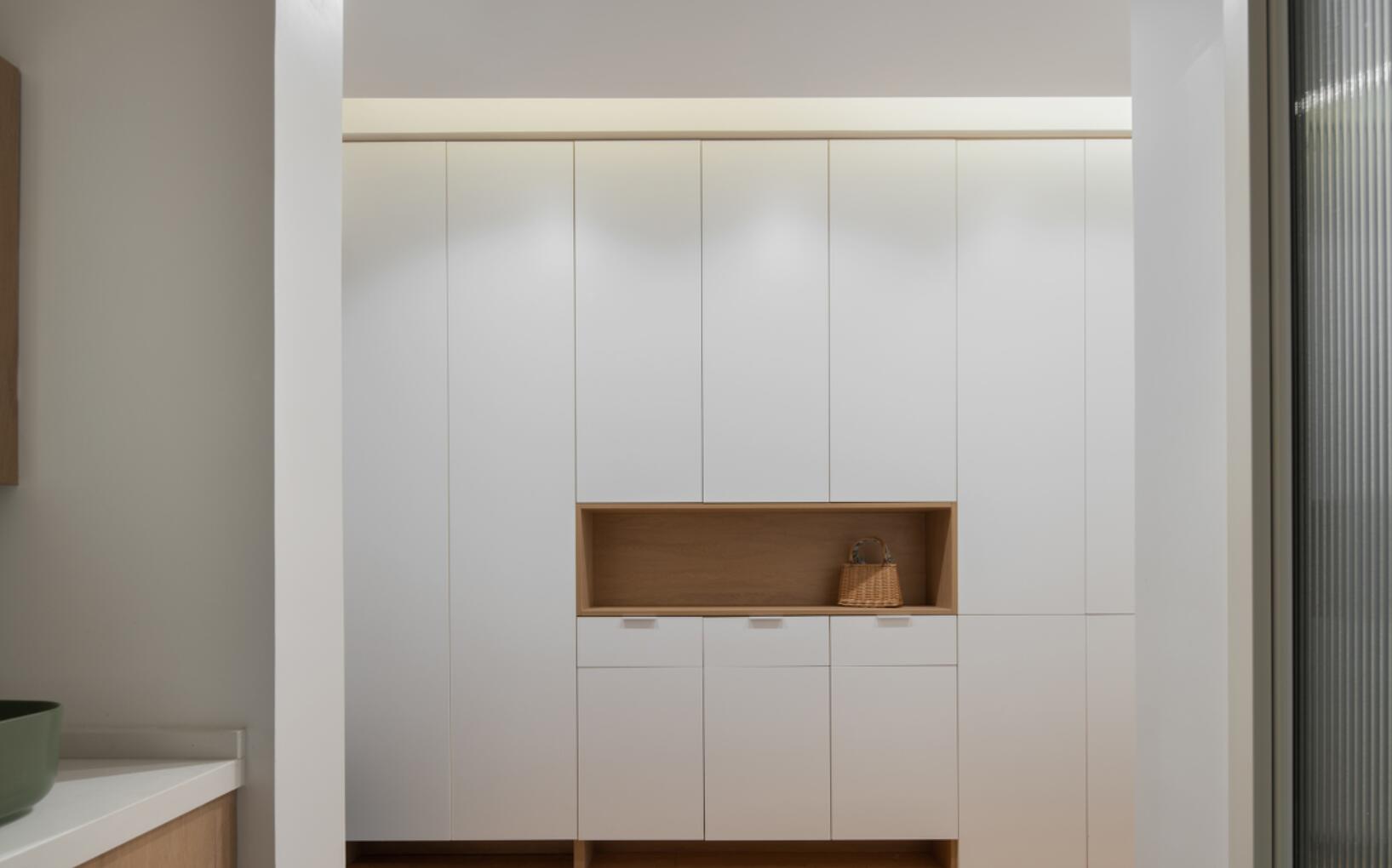 将储物柜设计在住户的左侧,可以最大限度的发挥玄关的收纳能力。柜体底部悬空,方便存放日常鞋子;中间位置是镂空的,方便放置包包和小件物品。同时,柜门做拉手处理,在没有住户的情况下,也起到了弱化和复杂化的作用。