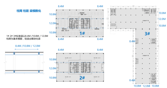 1、模数化设计:以基本的8.4米为基础单元模数、延伸扩展到10.8米、12米。通过模数化轴网地下空间停车的效率最大化、地上建筑的标准化。
