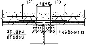 8、1#楼宿舍区标准层和3#楼标准层部分楼板采用中建科技集团自主研发的预制预应力带肋叠合板,相比于普通叠合板承载力更高,经济性好,连接节点位置利用桁架筋增加整体性,板与板之间采用密拼连接。