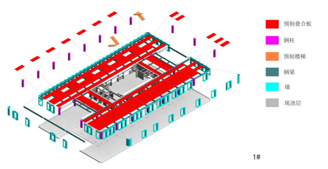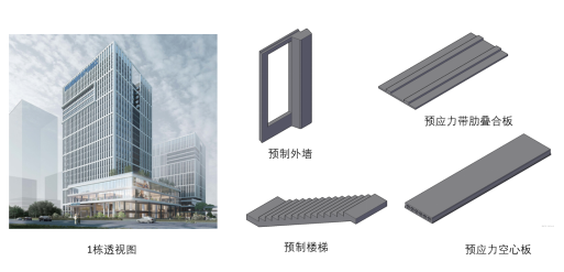预制构件种类由钢管混凝土柱、钢梁、预制外墙、预应力空心板、预应力带肋叠合板、预制楼梯、ALC条板等构成。