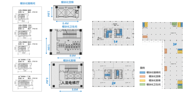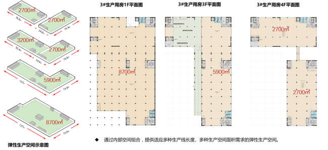2、模块化设计:以模数化的轴网为基础延伸出模块化的楼梯间、核心筒、卫生间等等减少设计种类、发挥装配式建筑的优势。通过模块化设计理念延伸出弹性生产空间,以900㎡为单元模块,可以组成900、1800、2700 、5400等多种生产空间、满足不同企业的不同需求。