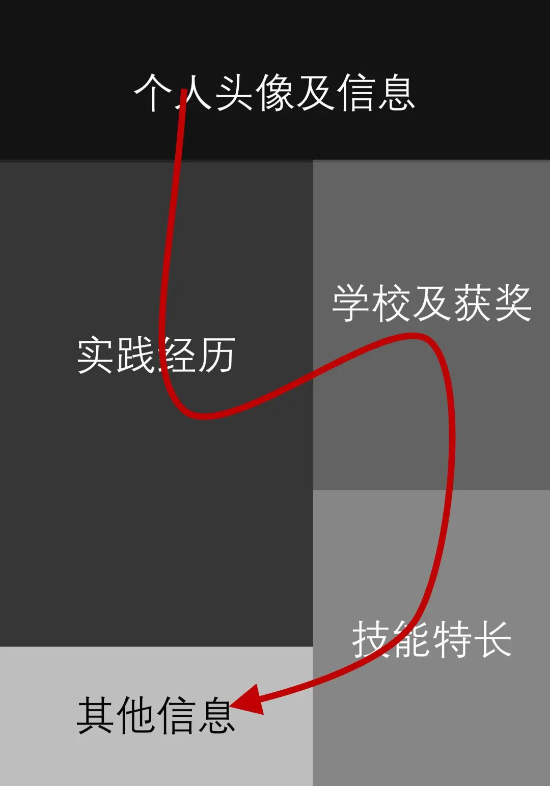 按照视觉阅读习惯:将个人经历模块,放在左上核心阅读部位、将学校及获奖模块,放在右上次级阅读部位。