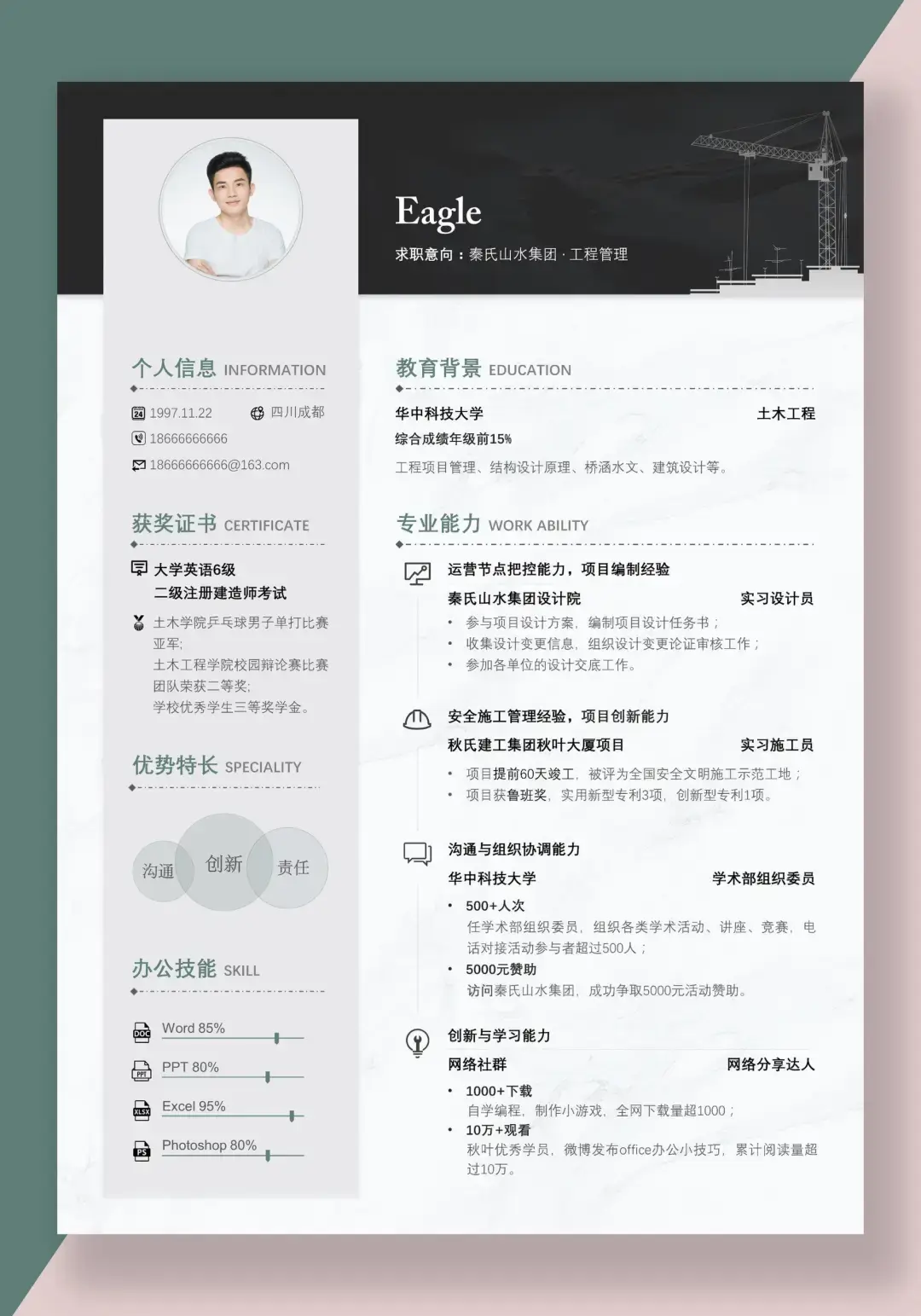把非重要信息组合罗列在左侧,做一个信息合集,还可以针对公司的特点,加入一些行业元素(塔吊)和行业的色彩(墨绿色)。