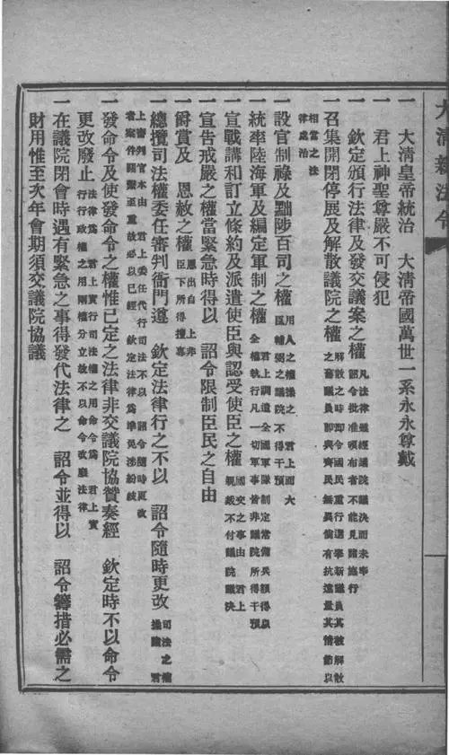 清朝光绪三十四年八月初一日(1908年8月27日)中国晚清政府颁布的中国历史上第一部宪法性文件。共计23条,由"君上大权"和"臣民权利义务"两部分构成。由宪政编查馆参照1889年由明治天皇颁布的《日本帝国宪法》制定,删去了日本宪法中限制君权的有关条款,充分体现了"大权统于朝廷"的立法旨意。彼时光绪帝因戊戌变法失败被幽禁在中南海瀛台,所以是慈禧以光绪帝的名义颁布。