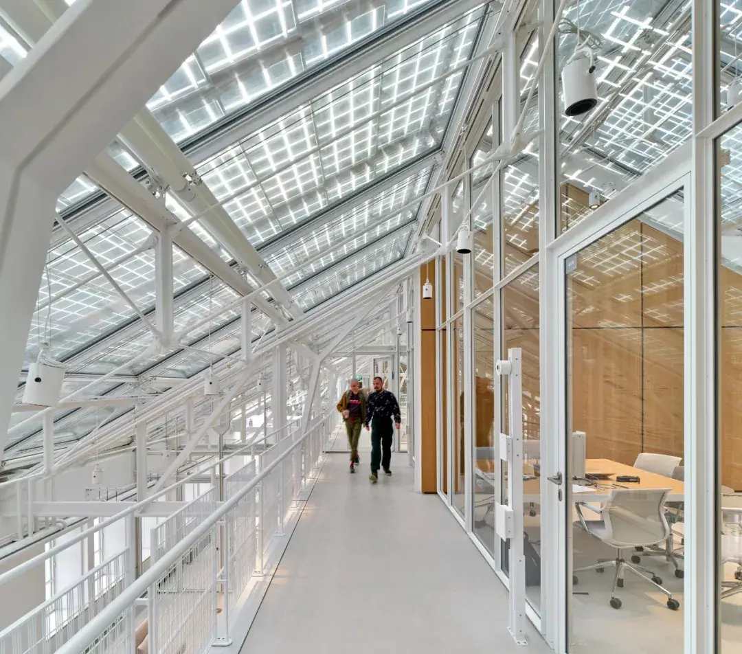 半透明的外墙包裹着轻盈的室内空间,使用的是聚碳酸酯材料,这是一种工业化的、重量轻的、灵活的和可回收的材料,这种材料的半透明性在历史和现代、重和轻、热和冷之间创造了一种对话与对比。