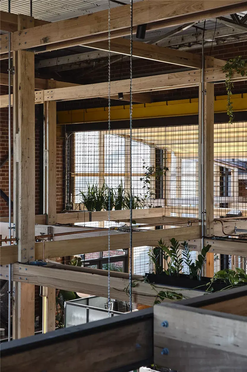 为了将内外空间在视觉上做出连续感,特意设计了一个全高木格结构——它被设计成裸露的模块化网格,这些木梁具有非常实用的功能:承载照明走线、啤酒厂机械设备等的载物架,也可作为绿植的攀爬架。