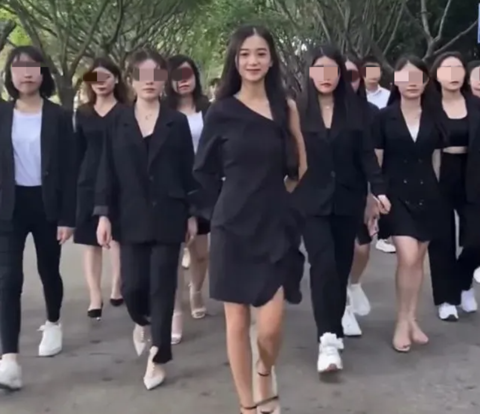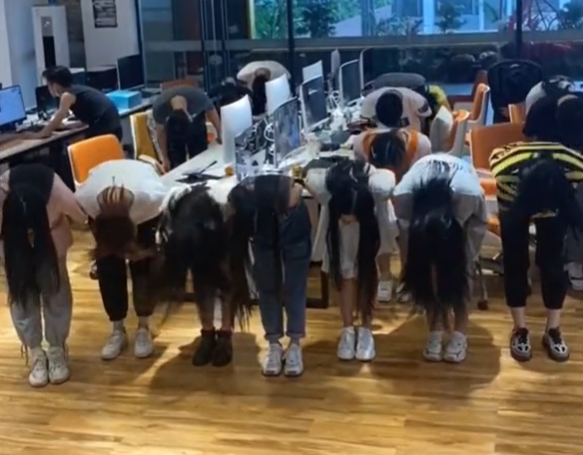 在广州的一个办公楼里,一个穿着蓝色牛仔裤的女生带着身后的几十名员工一起朝着面前的镜头鞠躬道歉。