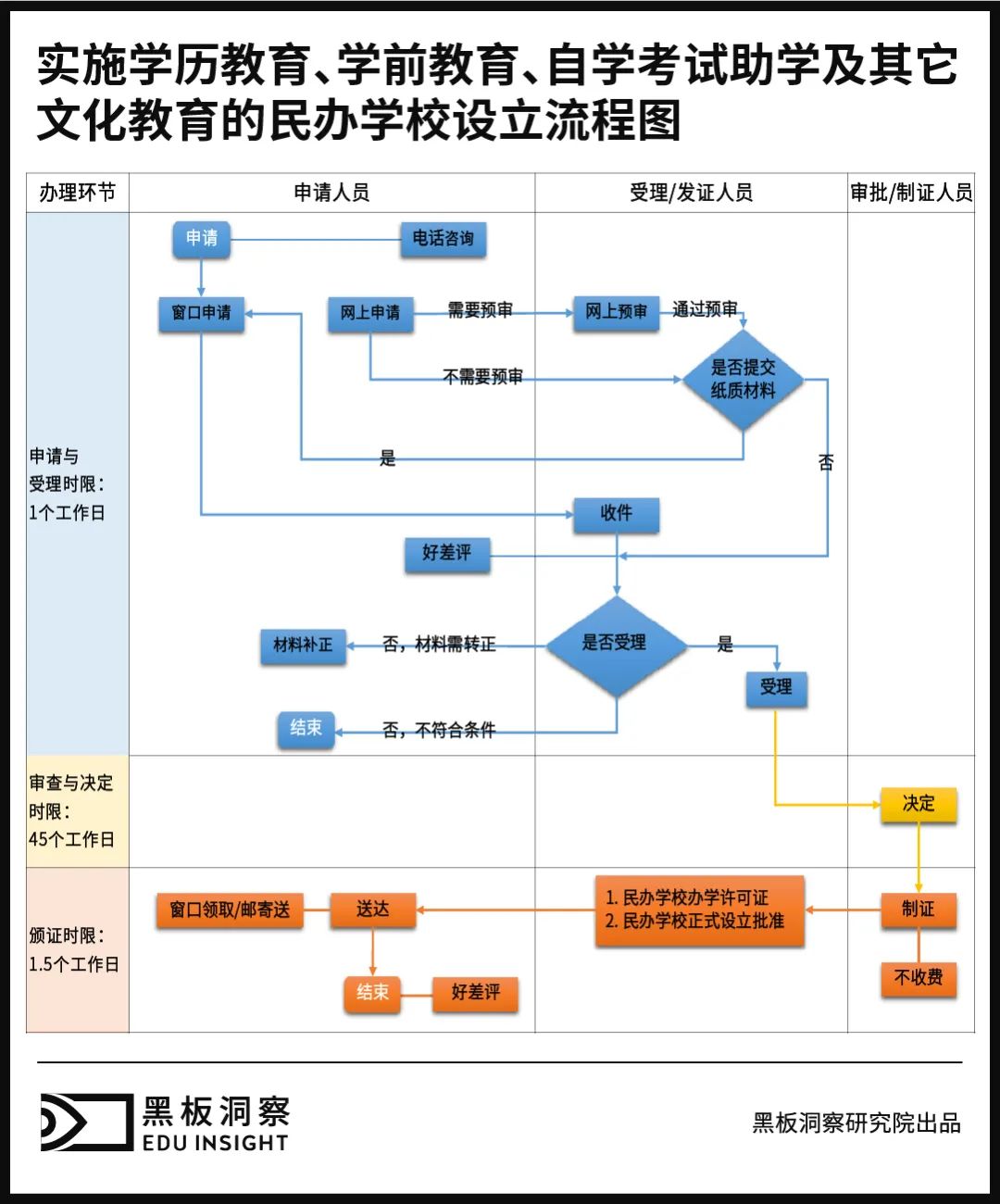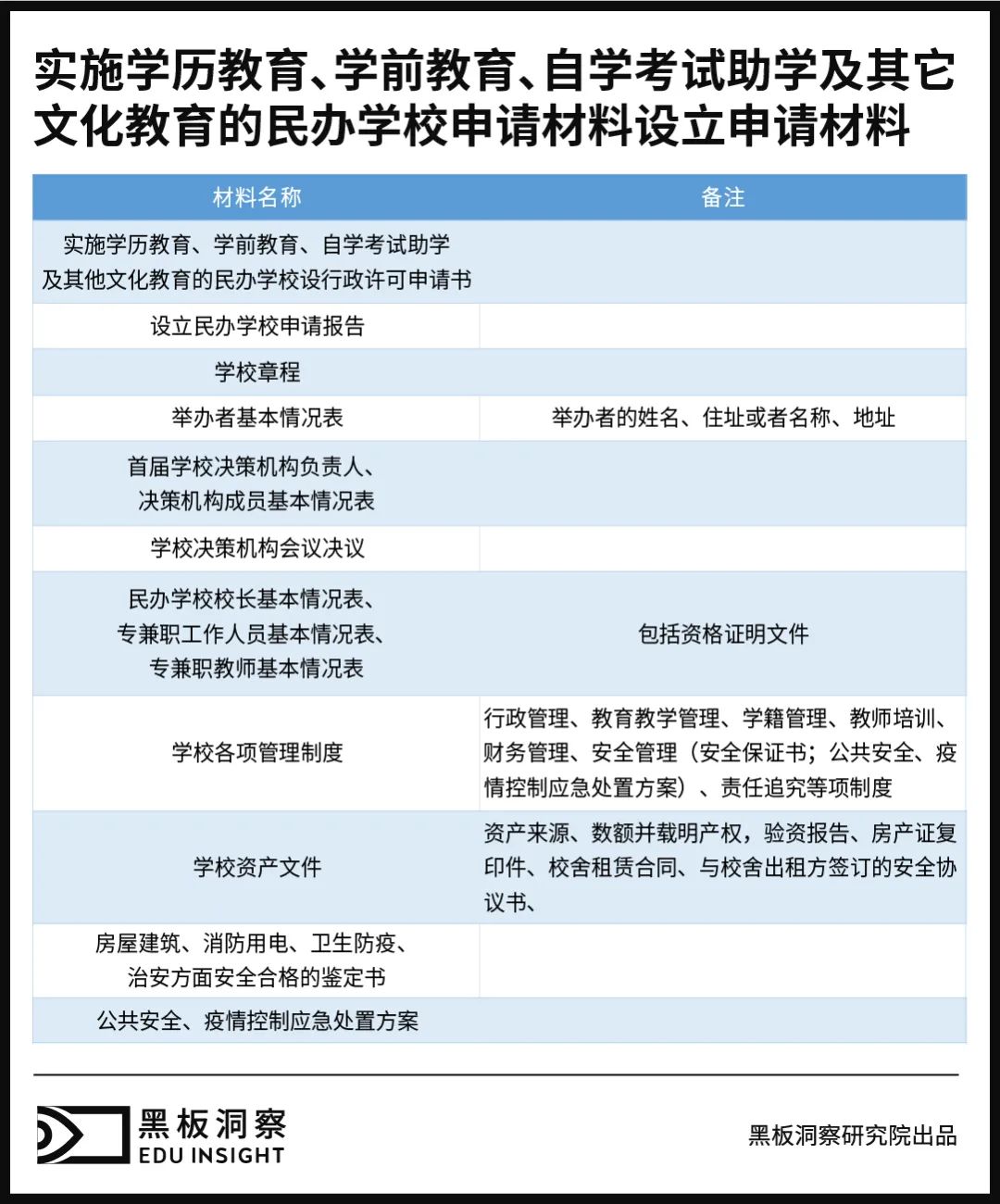 提交 11 大项资料只是申请设立民办学校的第一步。一般情况下,申请审查时间在 45 个工作日。民办学校除要提交上述材料外,还需要到各部门进行备案,如民办学校决策机构组成人员备案、民办学校学籍和教学管理制度备案、民办高校招生简章和广告备案等等。申请通过后会下发民办学校办学许可证和民办学校正式设立批准书。