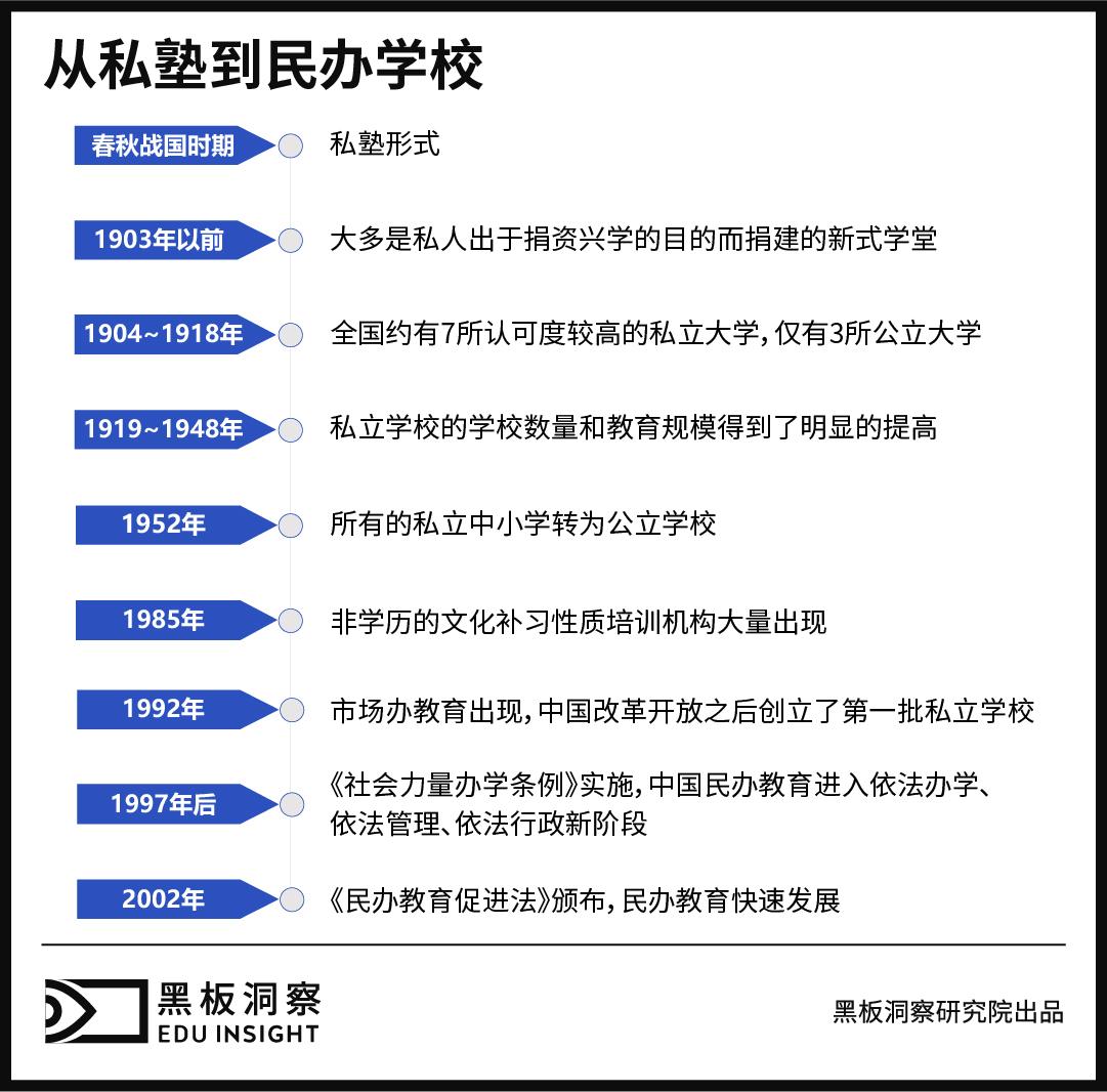 旧时私人所办的学校被称为私塾,后称为学堂。新中国成立之前,民办教育在我国担任着较重角色。1952 年,中央政府提出办学指示,要求将所有的私立中小学转为公立学校,中国私立教育因此在历史舞台中消退了一段时间。