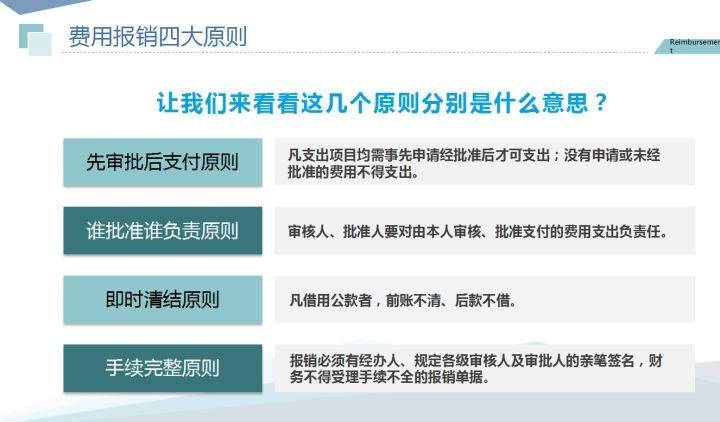 财务报销要有流程,只有按照流程才能“循序渐进”地完成,不然你干你的、我做我的,那效率就非常低下。所以报销要遵循“先审批后付款、谁批准谁负责、按时清结、手续完整”的原则。