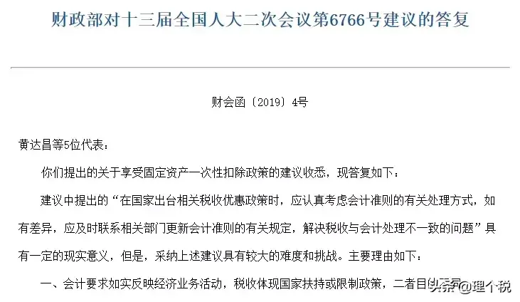 2019年两会期间,有人大代表基于固定资产一次性税前扣除政策的发布,提出一条“接地气”的提议:
