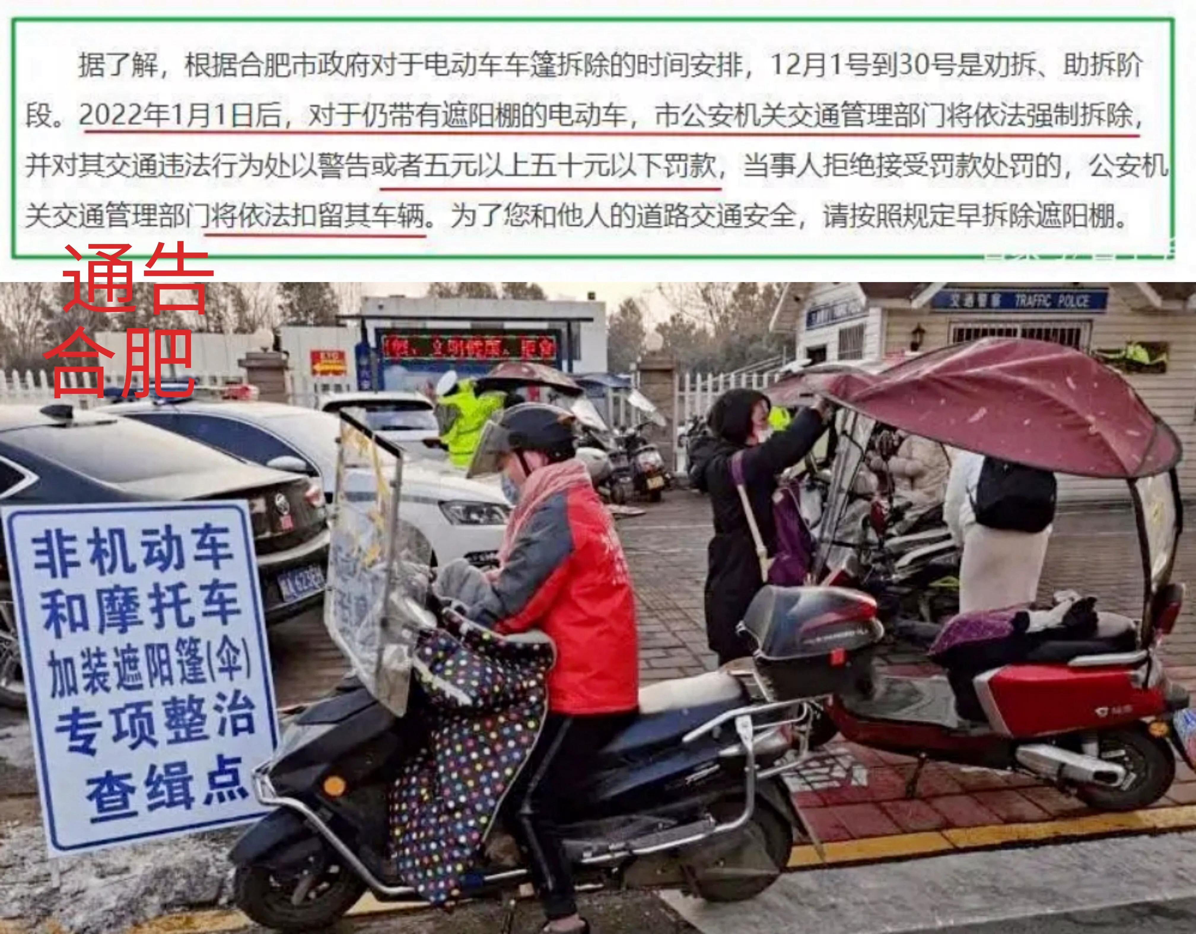 安徽合肥:2022年1月1日起,将依法对电动车自改遮阳棚进行拆除