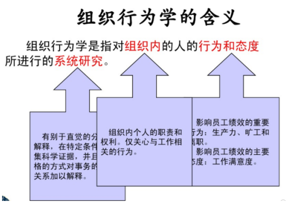组织行为学的含义:组织行为学是指对组织内的人的行为和态度所进行的系统研究,是一门研究管理中人的因素的学科。