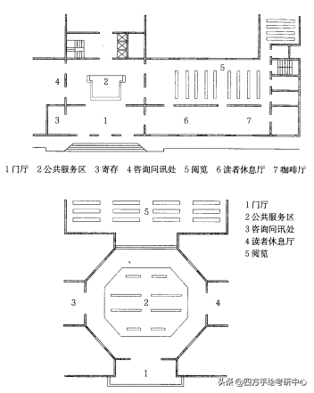 图书馆的公共服务区常与门厅、中厅、过厅结合,包括读者休息厅、咖啡厅、接待处、问讯处、电话室、寄存处及其他办理手续的咨询服务台和演讲厅、展厅、书店、茶座等。