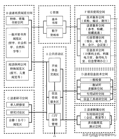 图书馆建筑的基本功能一般由藏书空间、阅览空间、目录检索、及出纳空间、公共活动及辅助服务空间、行政办公、业务用房及技术设备用房等部分组成。