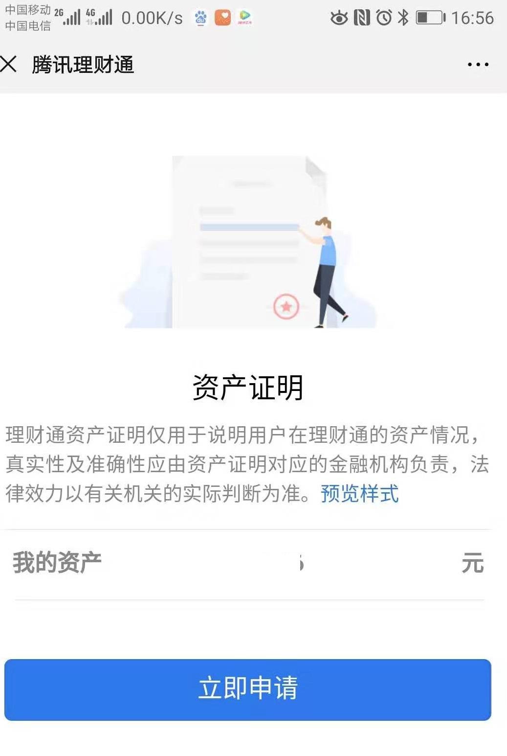 此时,页面中有三个资产证明选项,分别是“余额收支”、“余额资产”、“理财资产”,你可根据自己的实际需要进行点击申请即可!