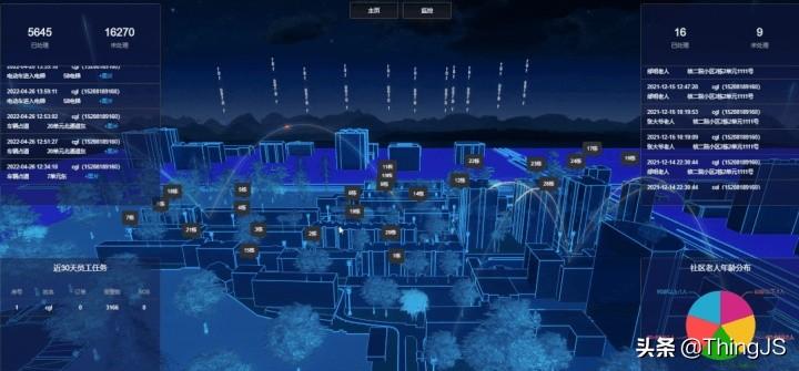 基于 ThingJS 数字孪生可视化开发平台开发的智慧社区可将社区安防系统及物业管理高效结合,为用户提供一个可以统一管理、实时感知、系统联动、实时分享的平台,一个系统即可支持社区安防、物业管理、社区服务等应用场景。