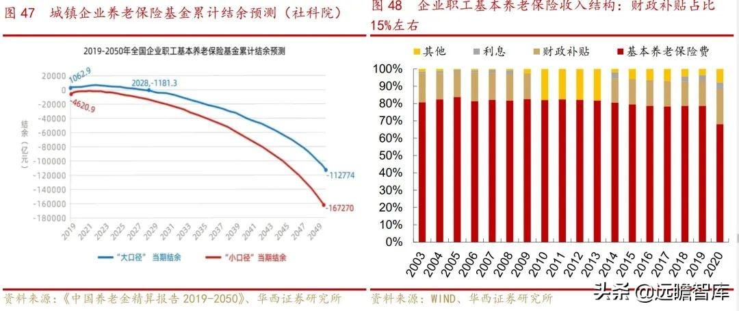 一方面,2020年基本养老保险基金累计结余首次同比-7.63%,反映基本养老保险负担繁重。根据社科院《中国养老金精算报告2019-2050》测算,全国城镇职工养老保险基金累计结余2028年可能首次出现赤字,不考虑财政补助的当期结余2019年已经为负值。