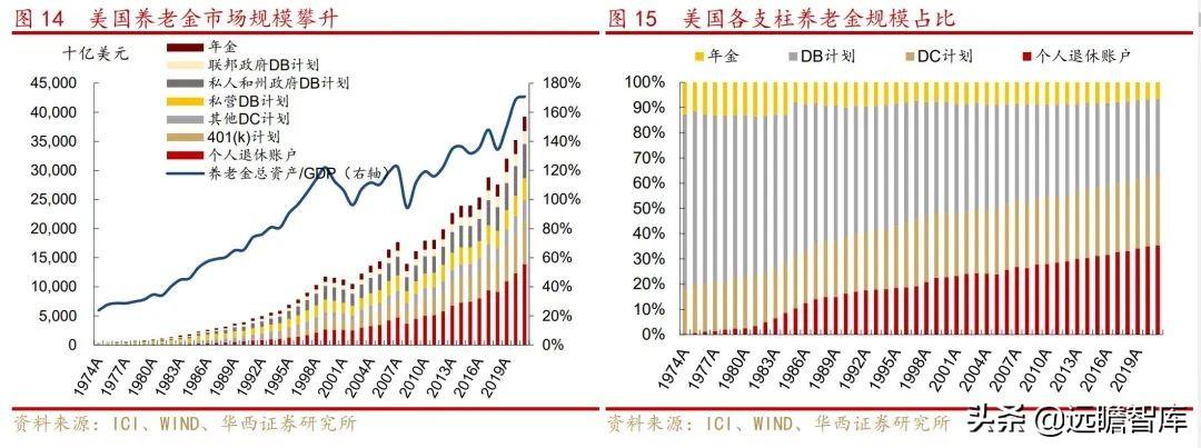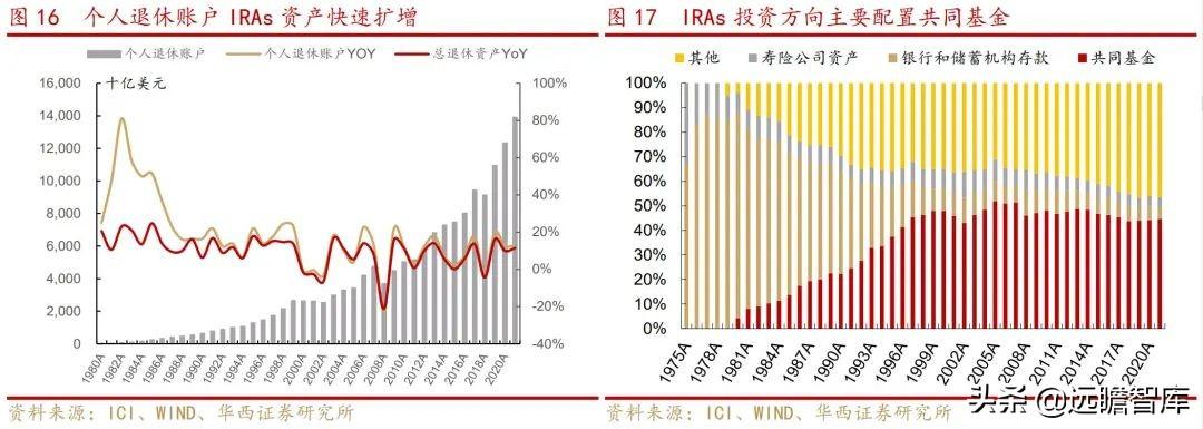 自1974年IRA账户推出以来,早期经历了快速扩增阶段,1974-2000年CAGR高达35%,2001-2021年增速回归稳健,整体CAGR约8.7%,仍快于一二支柱5%左右的年均复合增速,是养老金增长的主要贡献部分。
