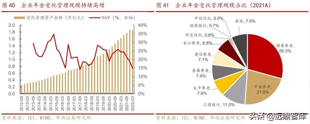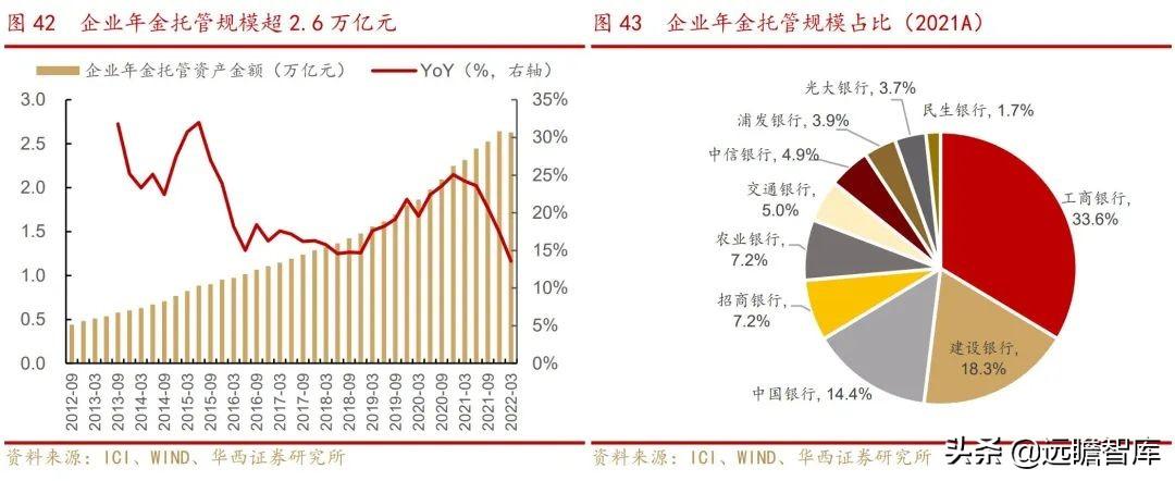 同样,伴随第二支柱企业年金规模的增长,银行管理和托管规模整体稳步扩增。商业银行在企业年金运营中扮演受托人、基金托管人和账户管理人的角色。目前我国商行共持有5张年金受托牌照、10张托管牌照和10张账户管理牌照(含建信养老等)。市场竞争格局来看,管理机构以险企占主导,工行、建信养老、招行跻身前十;十家托管银行中则由大行占主导,份额接近80%。