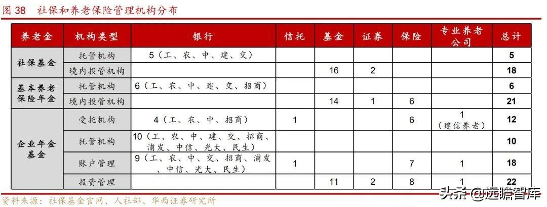 第一支柱来看,全国社保基金资产处于稳步增长过程中,整体投资运作的模式日益成熟。而社保基金运作的参与机构众多,涵盖银行和保险、基金、证券、信托、私募等非银机构(除委托投资方式外,全国社保基金理事会通过信托贷款、股权投资基金等形式开展全国社保基金的直接投资)。
