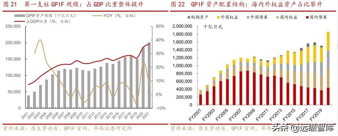 1)第一支柱公共养老金包括固定缴费的国民年金和收入关联型的厚生年金,由厚生劳动省于 2001年成立的日本政府养老金投资基金(GPIF)以市场化模式集中管理。从2001-2021年,GPIF资产管理规模从39万亿日元增加至201万亿日元,CAGR约8.6%,带动占GDP的比重持续攀升,2021年达到37%。