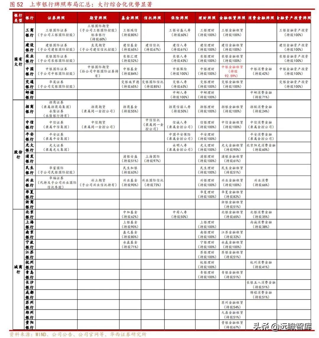 未来在公司层面,两条主线:1)具备牌照优势的大行和股份行,受益于子公司全面布局的综合化经营优势,能够在基金、保险、证券等非银领域实现全面金融产品供给,如工行、邮储等大行,及招商、兴业、平安等;2)具备较强资管能力,且区域优势突出的银行,如宁波、杭州、青岛等。