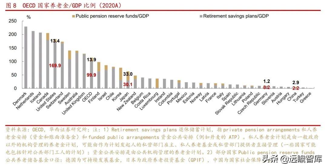 其次,总量来看,我国养老金/GDP比例低于国际水平。根据经合组织OECD数据,2020年全球Retirement savings plans(退休储蓄计划资产)规模超过54万亿美元,单从退休储蓄计划资产/GDP来看,OECD国家总体占比99.9%,OECD国家中有9个超过100%,以高福利的北欧国家为主,而美国、日本、德国分别为169.9%/30.1%/8.2%,同口径下我国养老金/GDP仅为2.2%(OECD仅统计了企业年金的规模)。