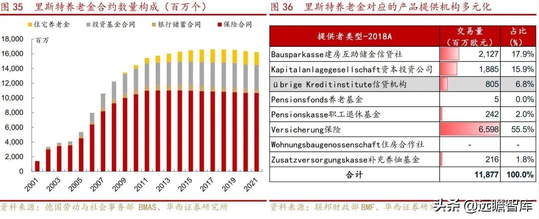 从合约构成来看,保险合约占2/3的份额,银行储蓄产品占比4%左右相对稳定。相比美国IRAs账户增配共同基金和权益基金等,里斯特整体配置结构偏保守。2010年以来,保险等产品合约数基本走平,主要是住宅类养老金规模实现增长。并且2001年里斯特养老金的最高保证收益率约为3.25%,伴随德国进入负利率时代,最高保证收益率2022年1月已降至0.25%,整体收益率较低。(报告来源:远瞻智库)