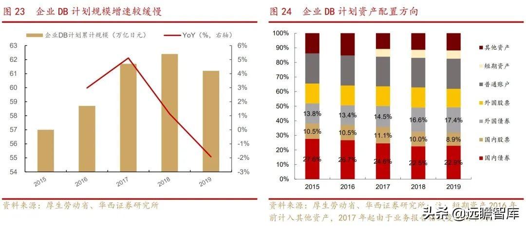 2)第二支柱企业养老金包括:待遇确定型DB计划、缴费确定型DC计划、一次性给付退职金制度LSSB、中小企业退职金共济制度SERAMA;可由投资顾问公司、投资信托公司、寿险、券商、银行等在厚生劳动省注册后作为第二支柱养老计划的投资管理人代理投资。单看有数据披露的DB和DC计划,分别在2019和2020年达到61.2和13.6万亿日元,仍以传统DB形式为主,但增速趋缓,而DC计划近十年规模增速CAGR为13%。