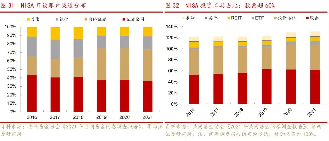NISA规模则由2014年的3万亿日元上升至2021年的26.9万亿日元。NISA账户可投范围广,资产配置上根据日本《共同基金问卷调查报告》,2021年股票和投资信托比例分别为61.3%、45.4%,股票投资占整体提升,ETF近年来也有较快增长,REIT占比则相对维持在2-3%。