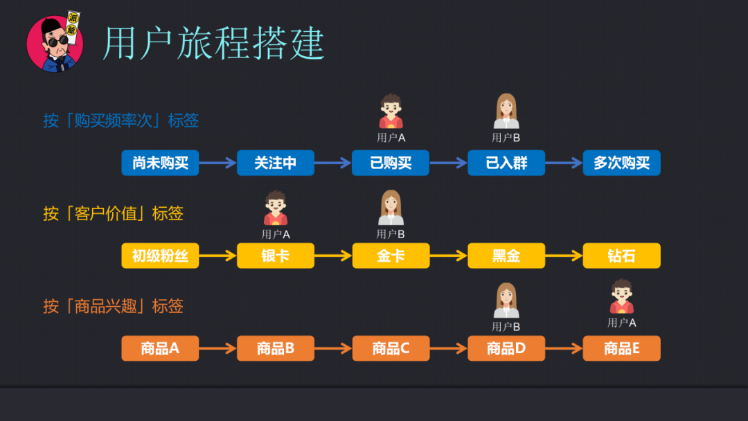 比如,现在有两个用户,他们的标签其实是一样的,但他们的用户旅程却往往是处于不同阶段的。