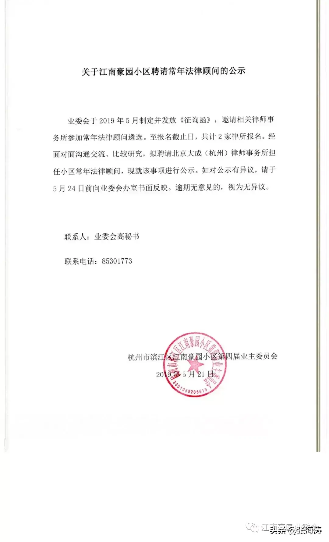 业委会于2019年5月制定并发放《征询函》,邀请相关律师事务所参加常年法律顾问遴选。至报名截止日,共计2家律所报名。经面对面沟通交流、比较研究,拟聘请北京大成(杭州)律师事务所担任小区常年法律顾问,现就该事项进行公示。如对公示有异议,请于5月24日前向业委会办室书面反映。逾期无意见的,视为无异议。