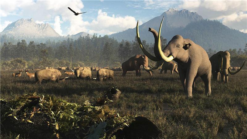 哥伦比亚猛犸象和野牛漫游北美古老的平原