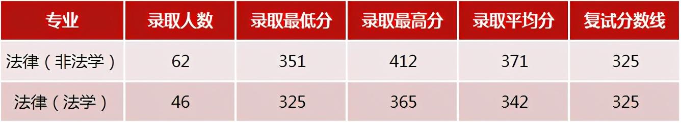 (2)法律(法学)专业录取46人,录取最低分325,录取平均分342,复试分数线325。