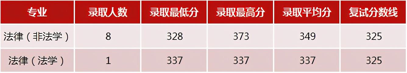 (1)法律(非法学)专业录取8人,录取最低分328,录取平均分349,复试分数线325;