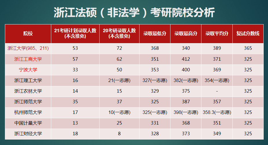但是浙工商20考研法硕(非法学)专业的录取最低分是351分,假如考生能以这样的成绩考上浙工商,还不如考一个211院校,对以后的就业更有帮助。