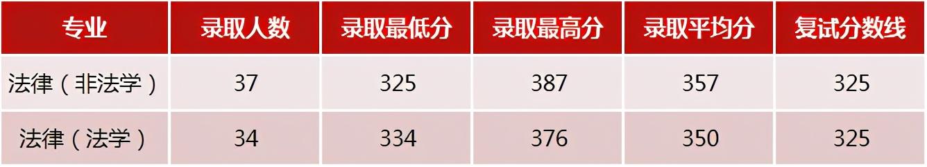 (2)法律(法学)专业录取58人,录取最低分327,录取平均分350,复试分数线325。