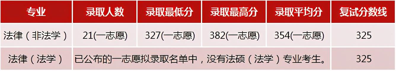 (1)法律(非法学)专业一志愿录取21人,录取最低分327,录取平均分354,复试分数线325;