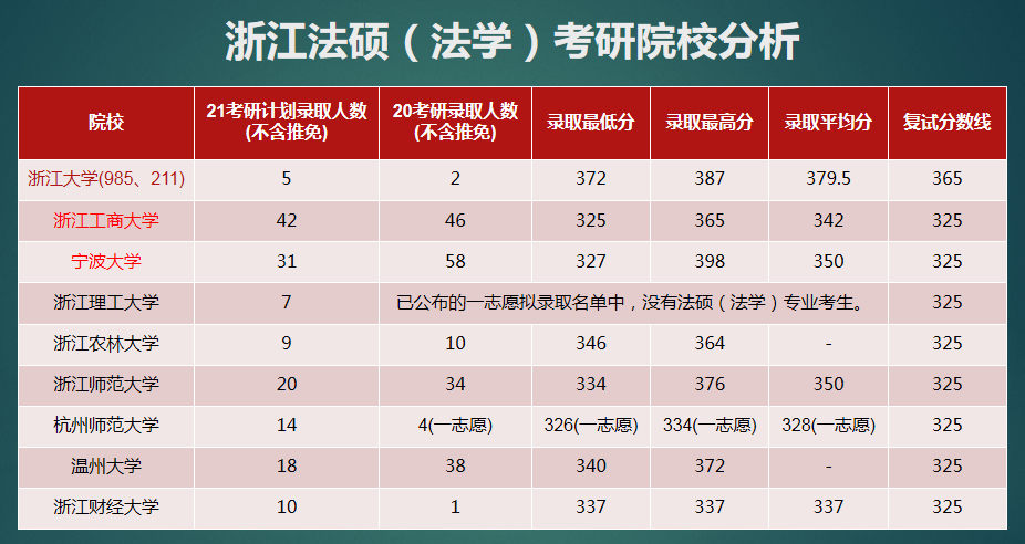 目前,浙江省共有10所法律硕士招生院校:浙江大学、浙江工商大学、宁波大学、浙江理工大学、浙江农林大学、浙江师范大学、杭州师范大学、温州大学、中国计量大学、浙江财经大学。