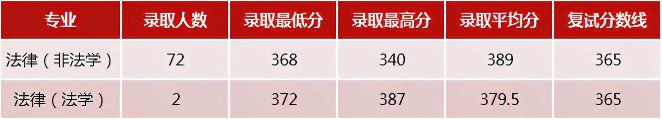 (2)法律(法学)专业录取2人,录取最低分372,录取平均分387,复试分数线365。