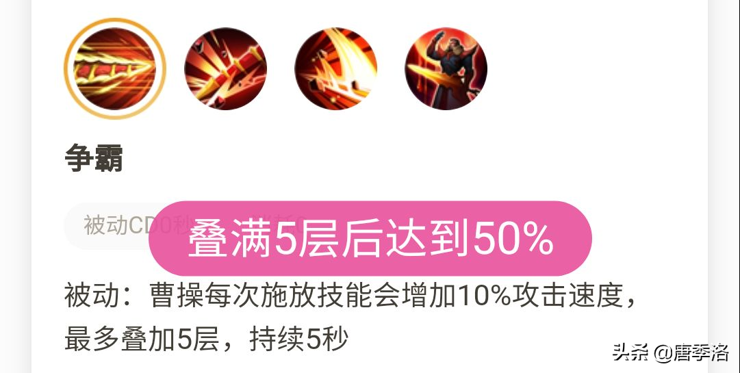 曹操这个英雄的官方定位是战士,被动效果最高可以有50%的攻速加成,这50%的攻速加成就相当于是五把匕首所带来的攻速加成,从某种意义上我们开局就比别人多了一千五百块。