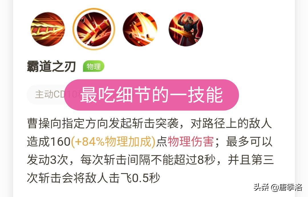 一技能霸道之刃,这是一个很吃操作的技能,有些像LOL里的瑞文的三段Q,拥有突击和输出以及第三段的击飞控制效果,连续的三段移和输出让曹操可以突进战场切敌方后排,如果敌方后排没有位移或者闪现就很难逃脱曹操的追杀。