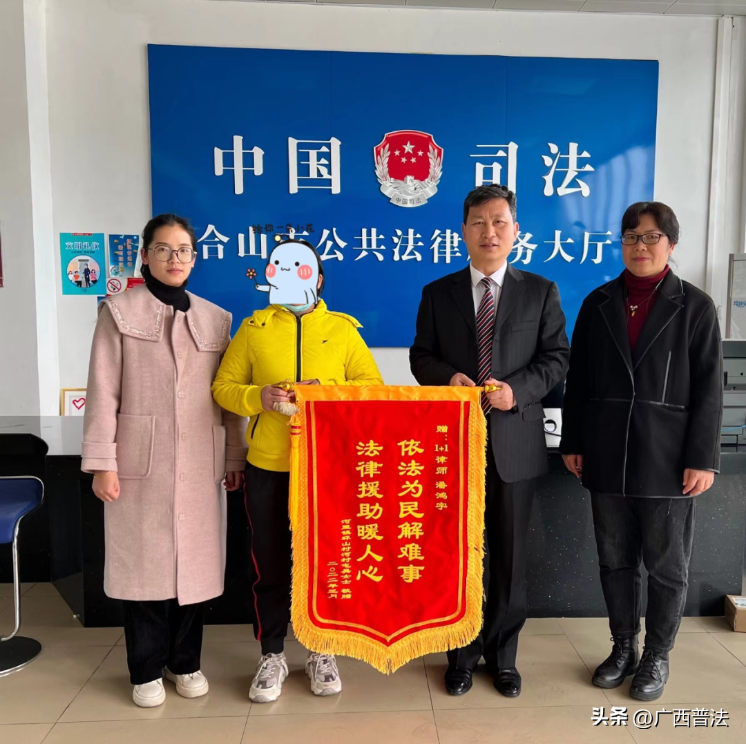 2022年3月4日,法律援助当事人吴女士向合山市司法局法律援助中心赠送锦旗表示感谢