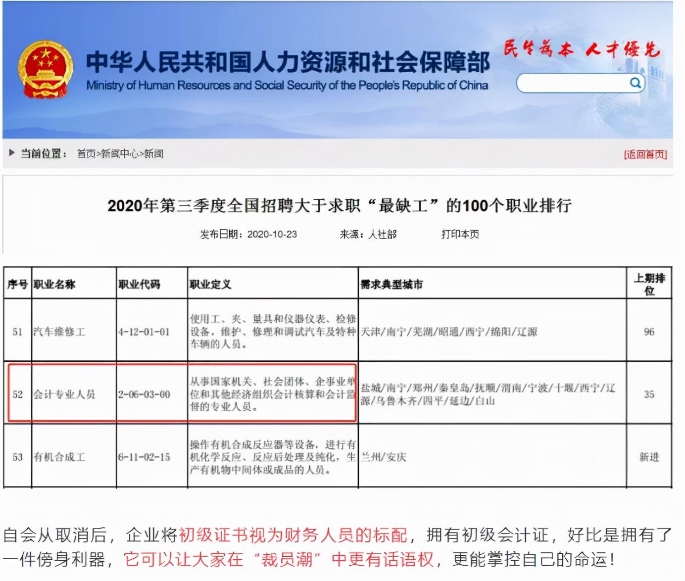 人社部公布了最新文件《2020年第三季度全国招聘大于求职“最缺工”的100个职业排行》,在文件显示:2020年第三季度,全国招聘求职100个短缺职业排行当中,会计专业人员排名第52名!大量的岗位稀缺,财会就业市场依旧广阔!